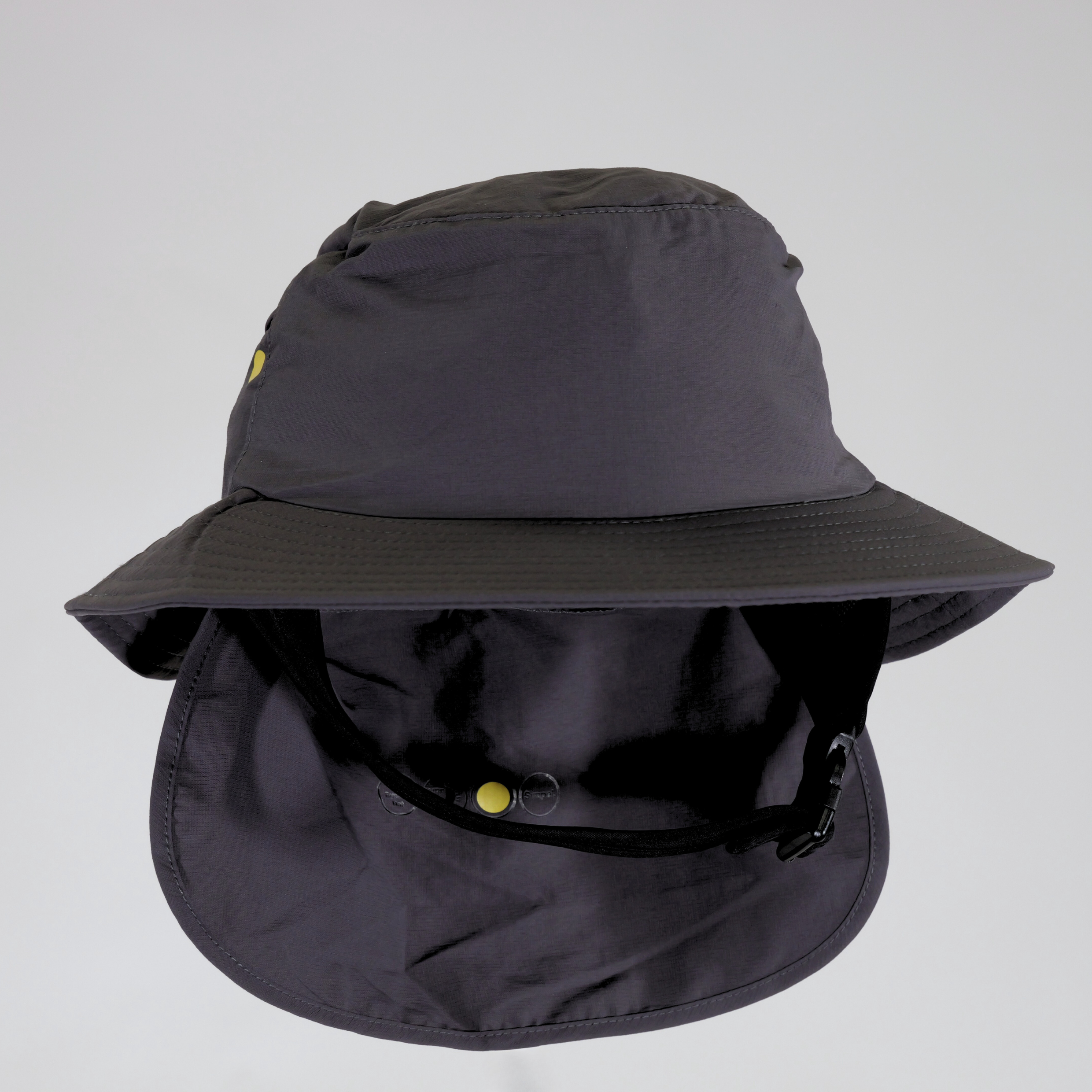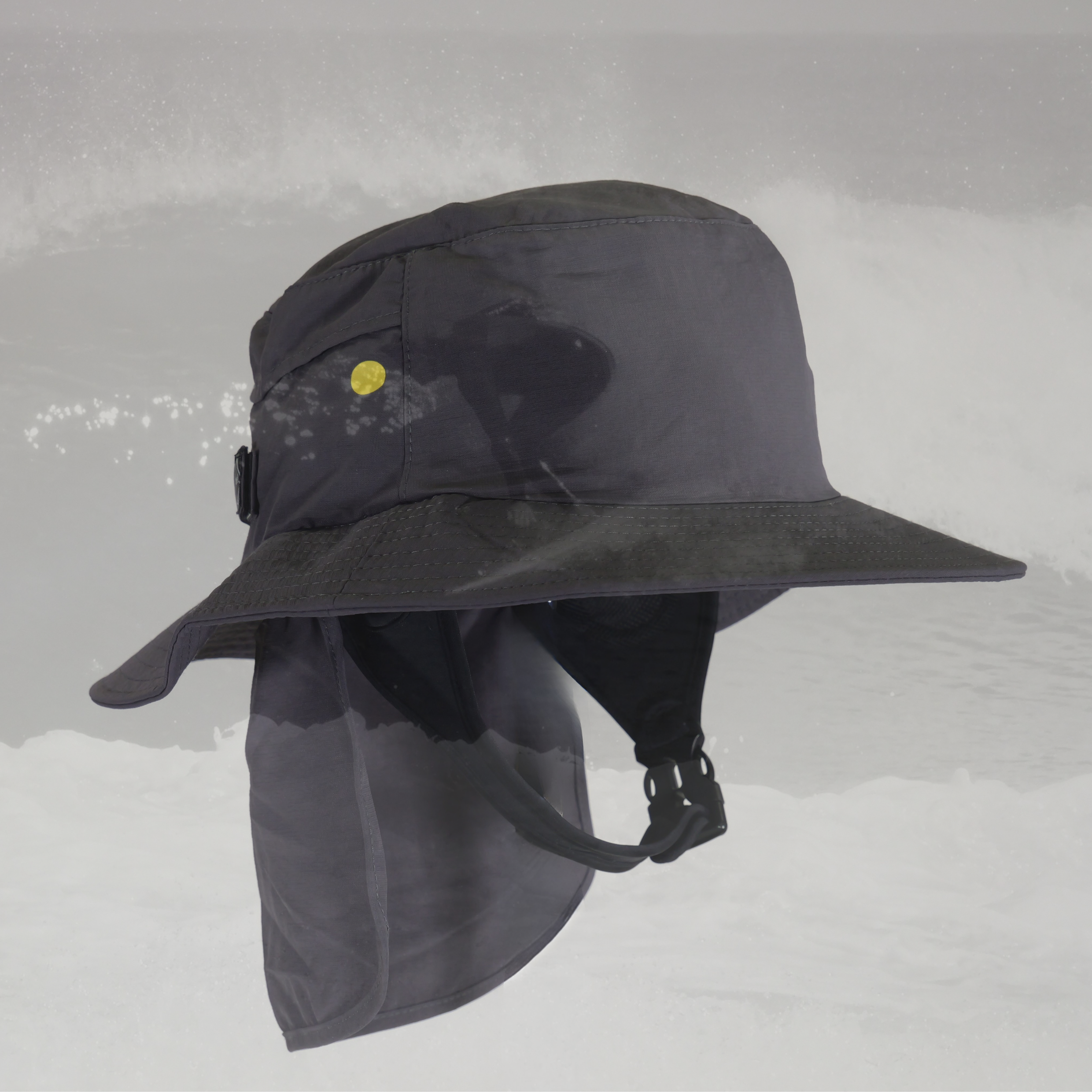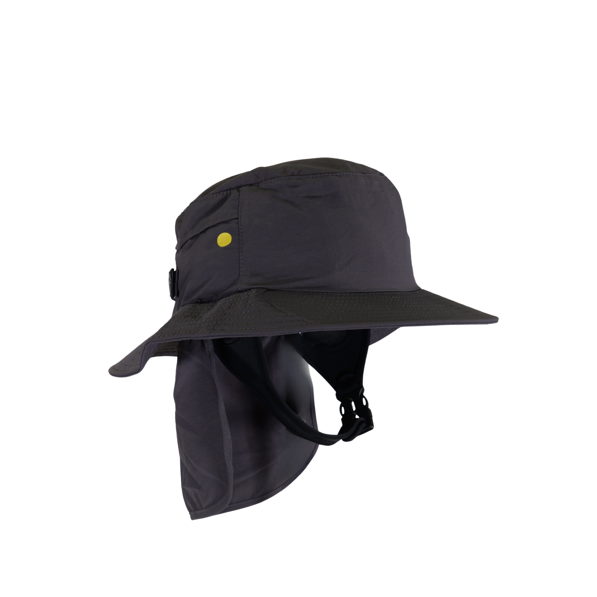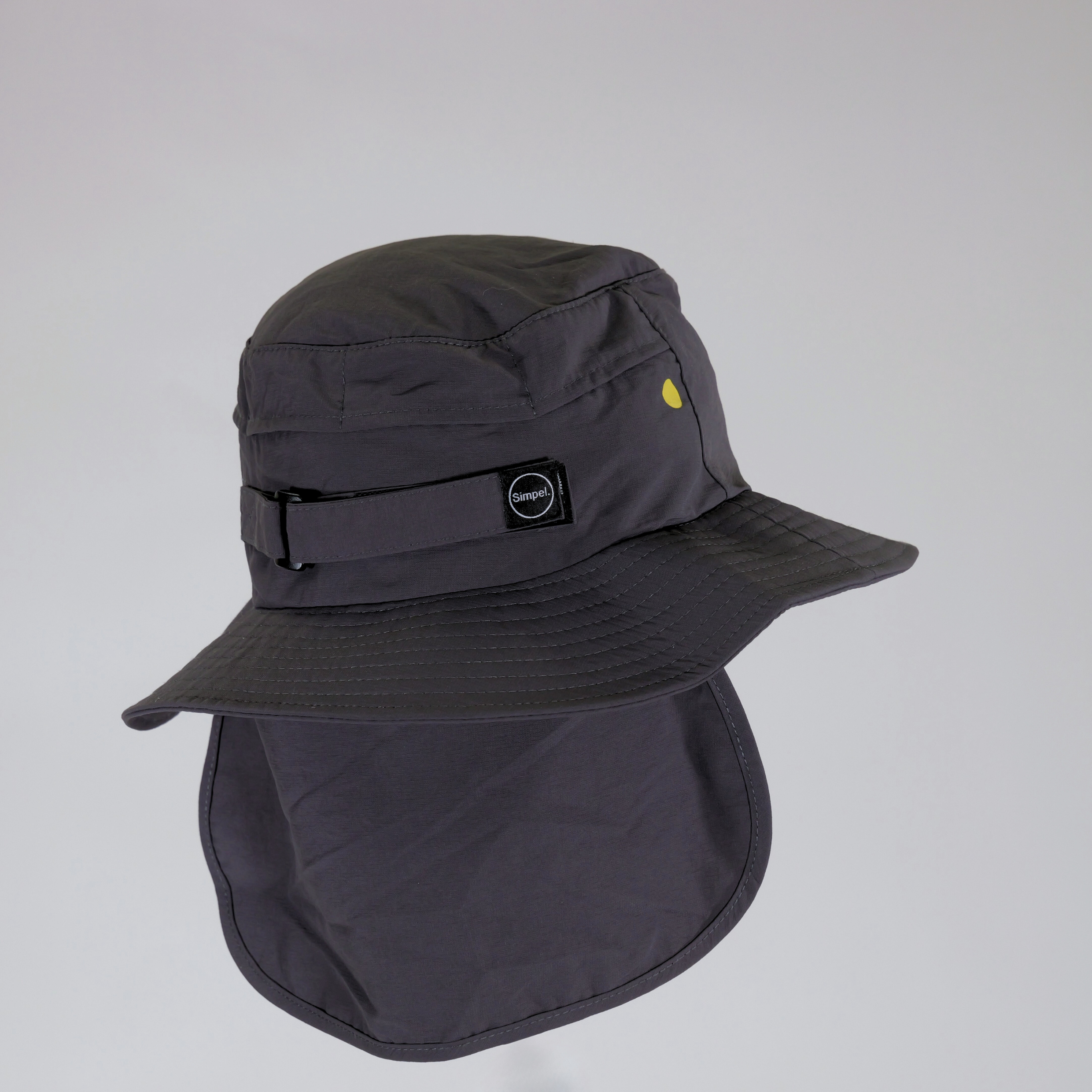 The Simpel Wide Brim Surf Bucket Hat in charcoal is built to offer reliable sun protection in the surf. An adjustable neoprene chin strap and Velcro rear closure create a secure, one-size-fits-all fit.