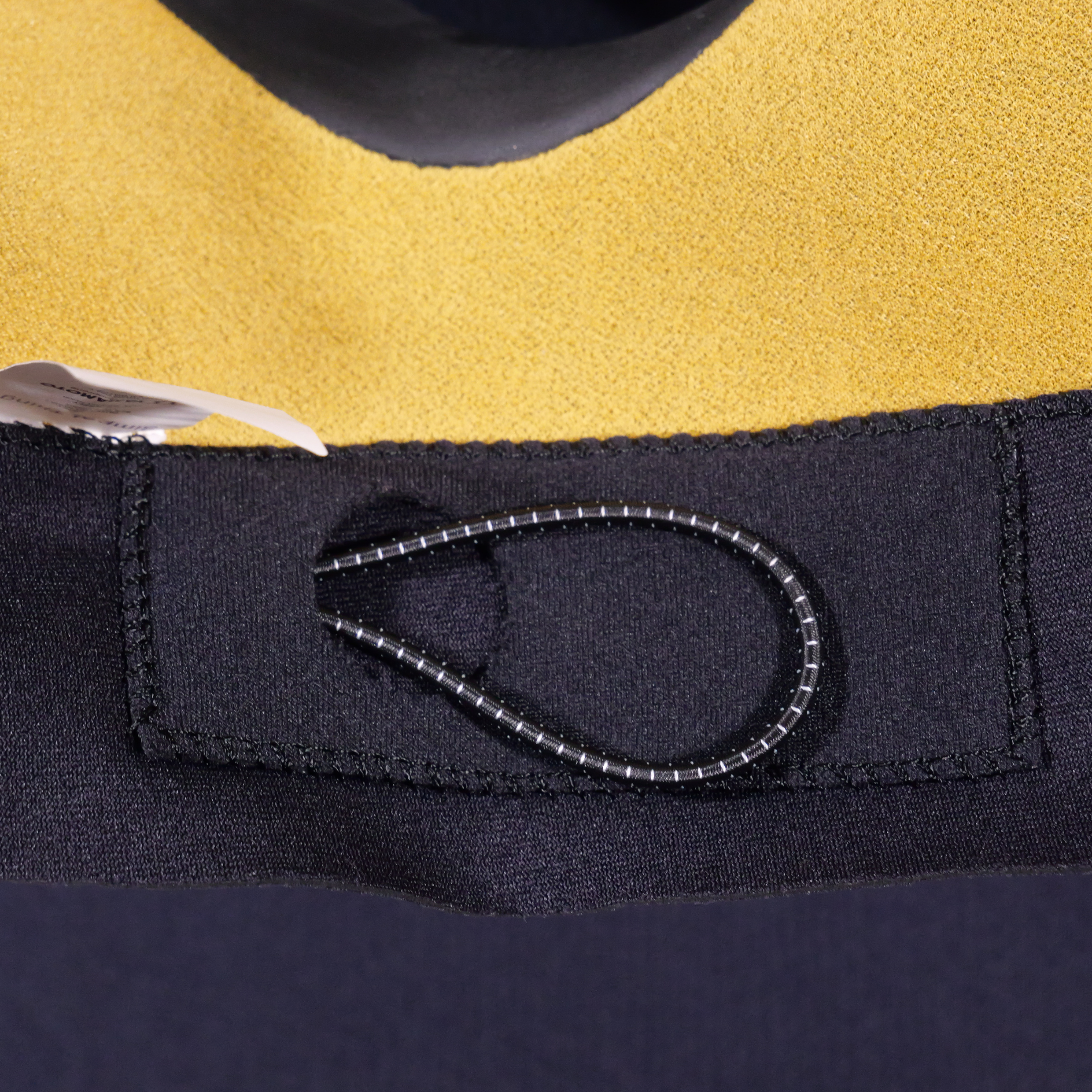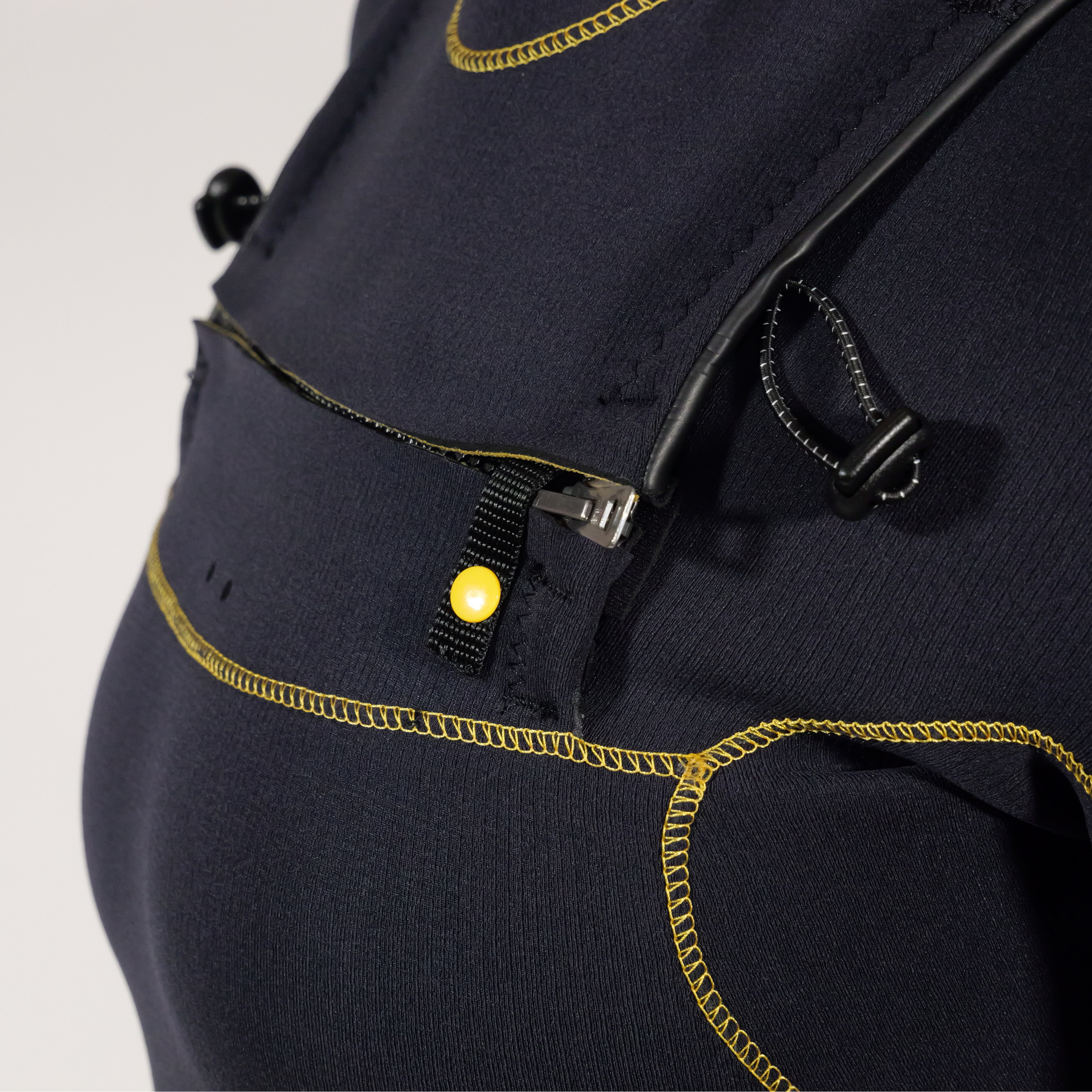 To help prevent flushing, discreet drain holes are positioned at the front and rear of the neck panel. If water enters the bib, it can escape easily rather than pooling, reducing water movement inside the suit and helping maintain a consistent fit in the water.